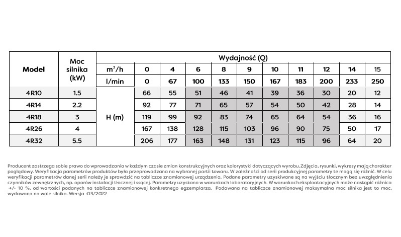 Pompa głębinowa Belgiardino 4R26 400V wyposażona została w jednostkę zasilającą dającą moc na poziomie 4000 W. Dzięki temu można liczyć na stałe ciśnienie w wysokości aż 16,7 bara, a sama pompa umożliwia pozyskiwanie wody z głębokości do 167 metrów i transportowanie jej bez przeszkód na powierzchnię, gdzie zasilać będzie budynki domowe, firmowe czy gospodarcze. Wydajność pompowanej wody, jaką gwarantuje producent to 250 litrów na minutę.